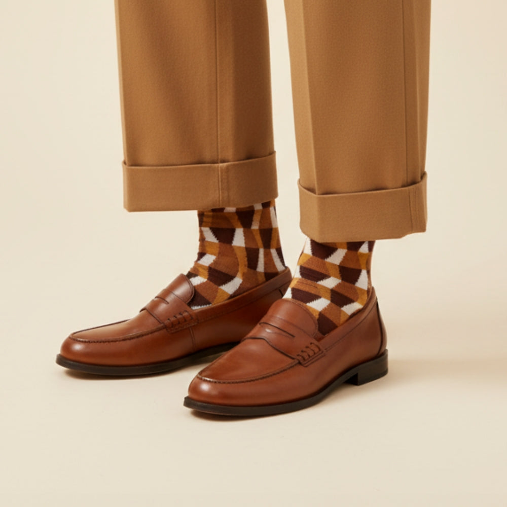 Warm earth tones – brown, terracotta, and off-white – stack infinitely and create movement with every step.