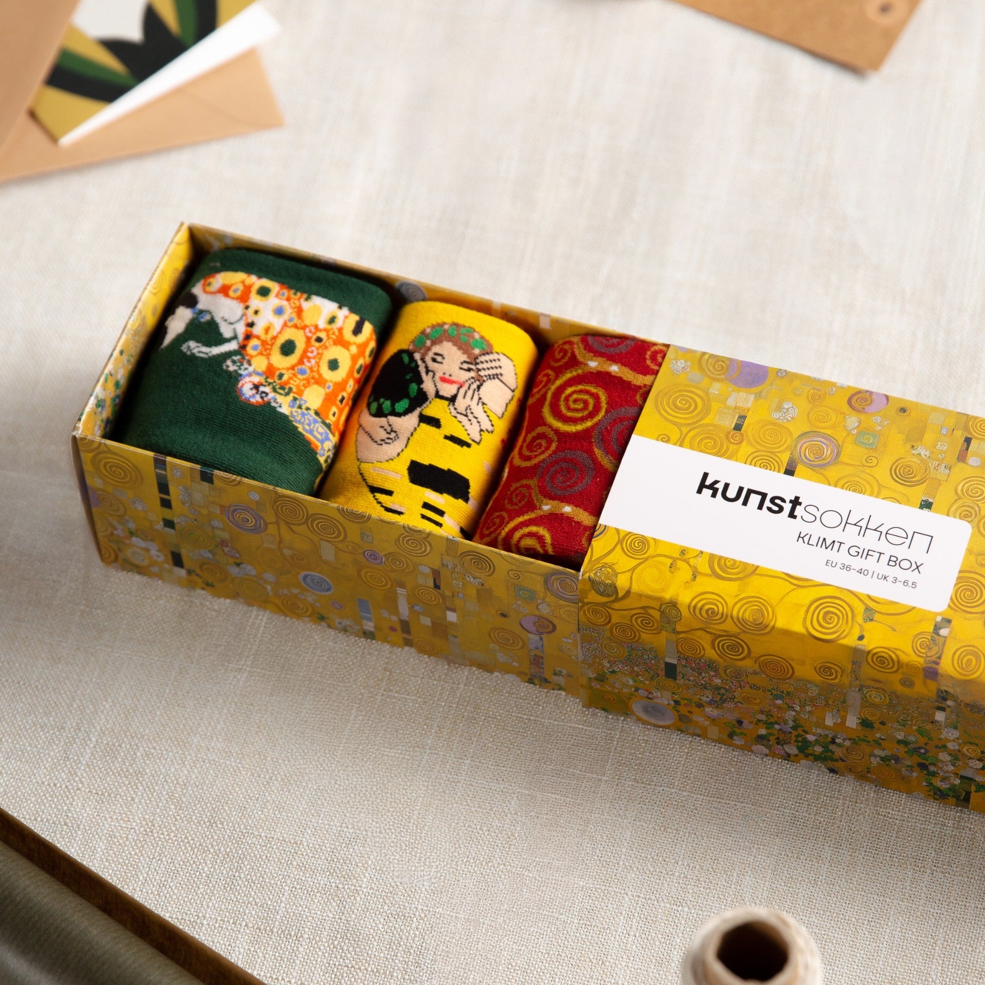 This exclusive gift box combines three iconic works by Gustav Klimt in stylish packaging, perfect for lovers of Art Nouveau art who are looking for a unique gift.