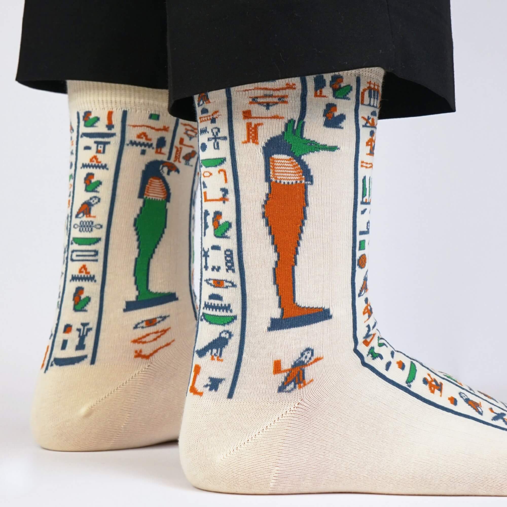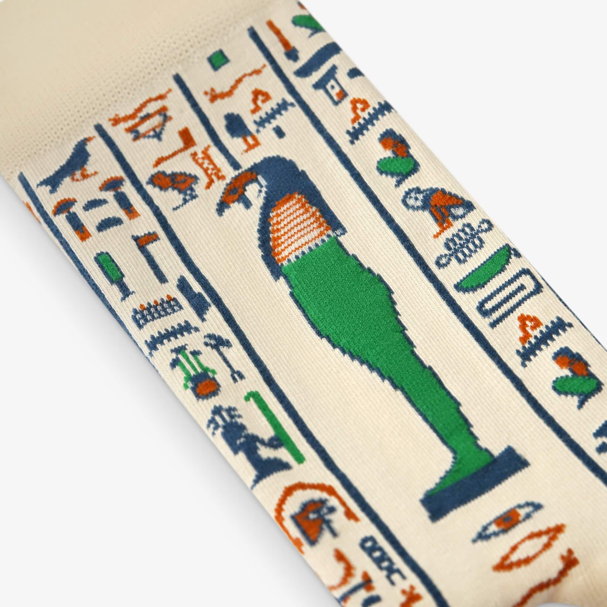 With these socks, you're not just wearing a beautiful piece of Egyptian art, but also a story about protection and eternal life. Every color and symbol is precisely knitted into the sock, bringing the details of the original coffin to life – from the vibrant blue and green tones to the delicate hieroglyphs running between the divine figures.